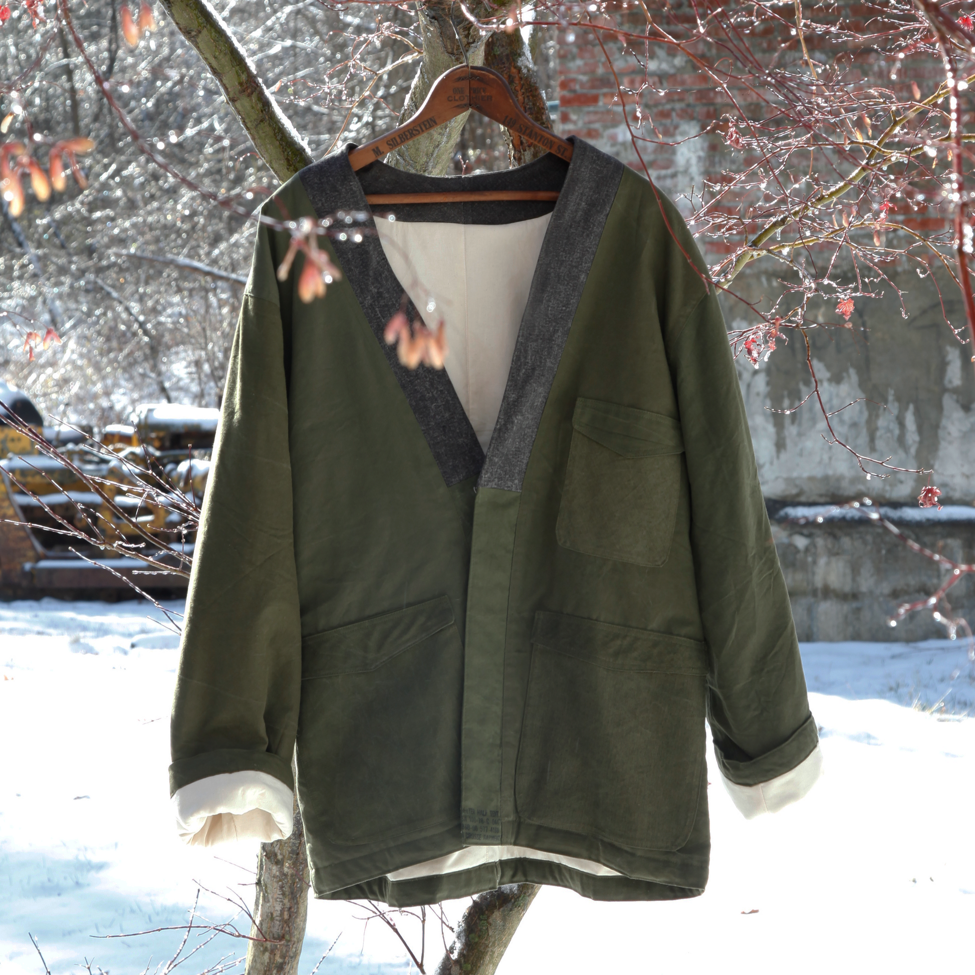 Crafted from a reclaimed U.S. Army half-shell tent, this one-of-a-kind kimono blends rugged history with modern, artful design. The original military canvas gives the kimono its deep olive hue and subtle tonal variations—natural marks that honor the material’s history and makes this garment entirely unique.