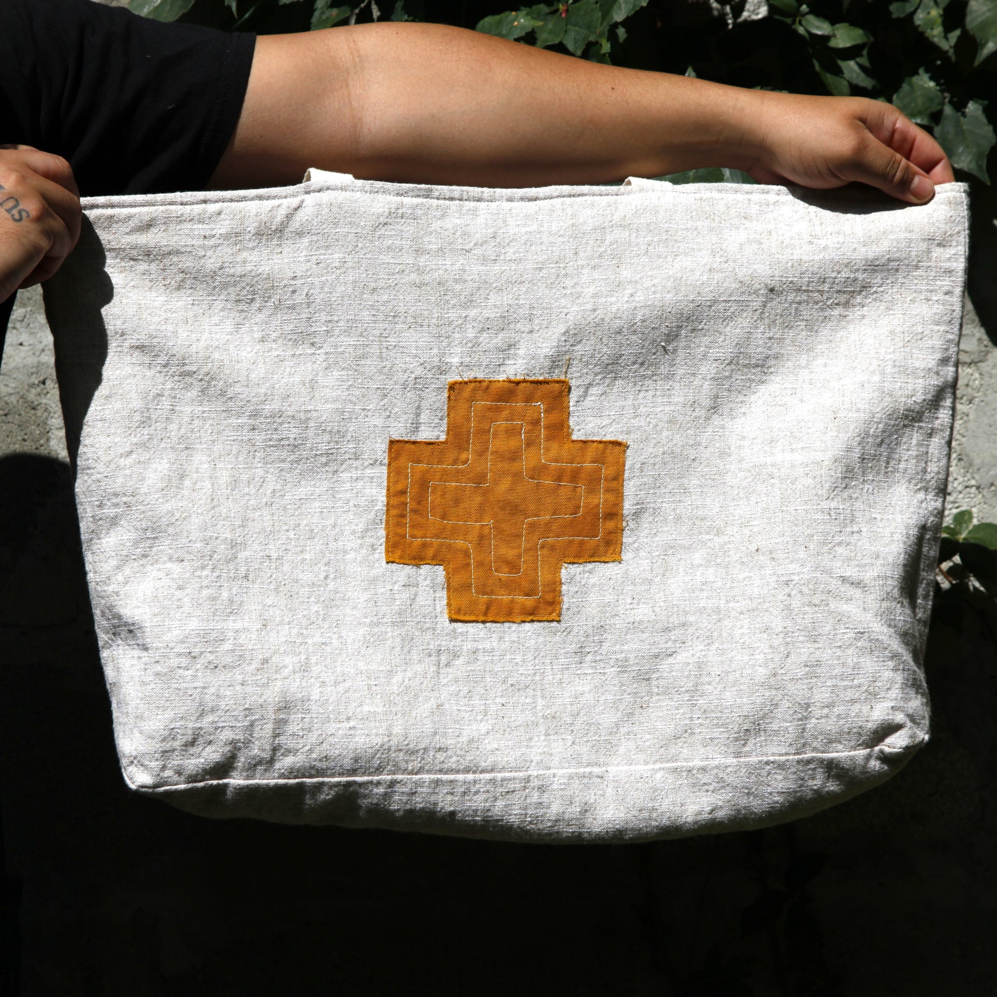This tote bag strikes the perfect balance between bold, artistic style and everyday practicality. This piece is one of a kind, featuring original sewn-on designs on both sides: a striking red skull with dark green leaves on one side, and a bold orange cross on the other.